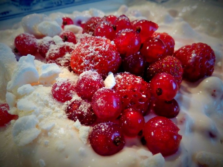 2 Becher Quark mit Zucker, Vanillezucker und etwas Milch glatt rühren. In eine große Schüssel geben oder auf mehrere hübsche Gläser verteilen. Johannis- und Erdbeeren (im Sommer aus dem eigenen Garten) und klein zerteilte Baisers aus dem Supermarkt unterheben. Einige Beeren zur Deko oben auflegen, dann zur noch verlockenderen Deko weitere Baiserstückchen oben daraufgeben. Bon appétit! 🙂