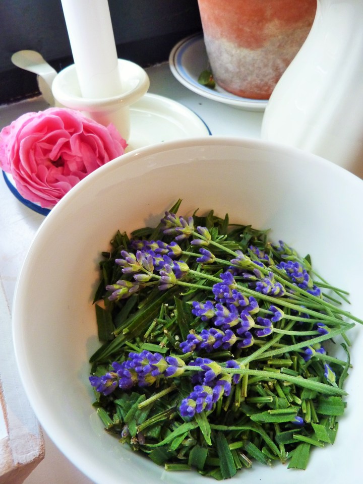 Die Stängel und Blätter duften auch ganz wunderbar, werft also nichts weg! Ich schneide alles, was nach dem Sträußchenbinden übrig bleibt, mit einer Schere in kurze Stücke und gebe es flach in kleine Schälchen und Teller. Noch ein paar Blüten zum Dekorieren darauf, schon riecht es nach Sommer, – und es sieht auch noch richtig hübsch aus. Wenn alles gut getrocknet ist, könnt ihr es dann in kleine Duftsäckchen füllen – oder ihr laßt es als Potpourri stehen. Die Sträußchen sind auch ein schönes Mitbringsel für die nächste Gartenparty und eine entzückende Deko für Eure Gartengeschenke. Oder ihr bindet einfach kleine Namensschilder daran … und schon ihr habt sommerliche Platzkärtchen.
